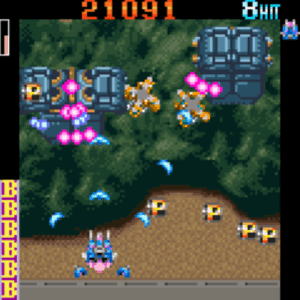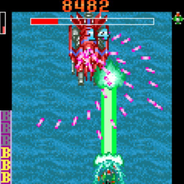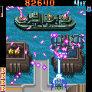 Both stages have a mid-boss with a life bar and you could destroy the arms of the second-stage boss, revealing a more-difficult bullet pattern. Even the chaining system arrives intact, carrying over the GP meter in the upper-left-hand corner and the usual dance of popcorn enemies, lasering tougher foes, revealing bees via said laser and harsh scoring punishments for bombing.