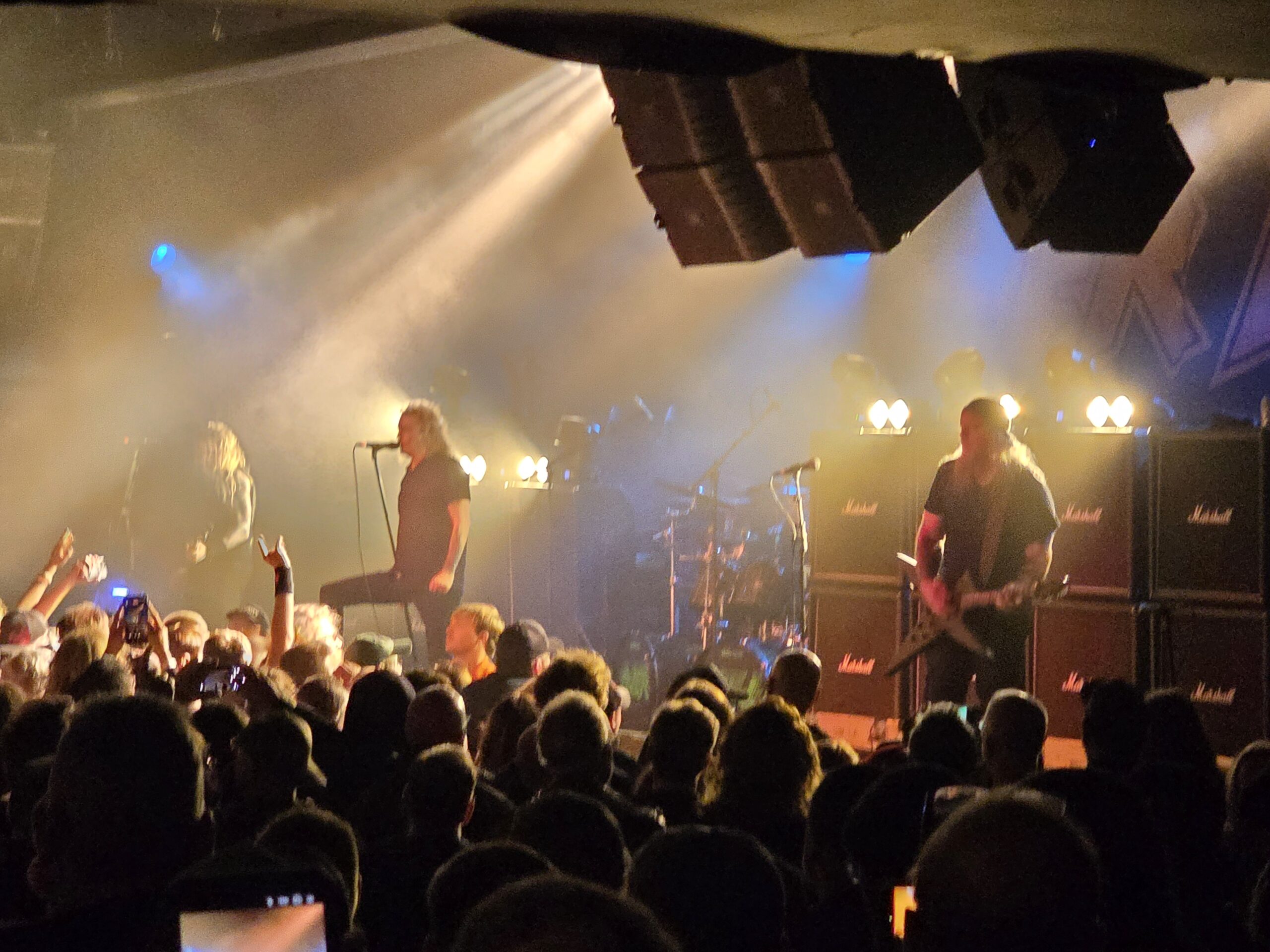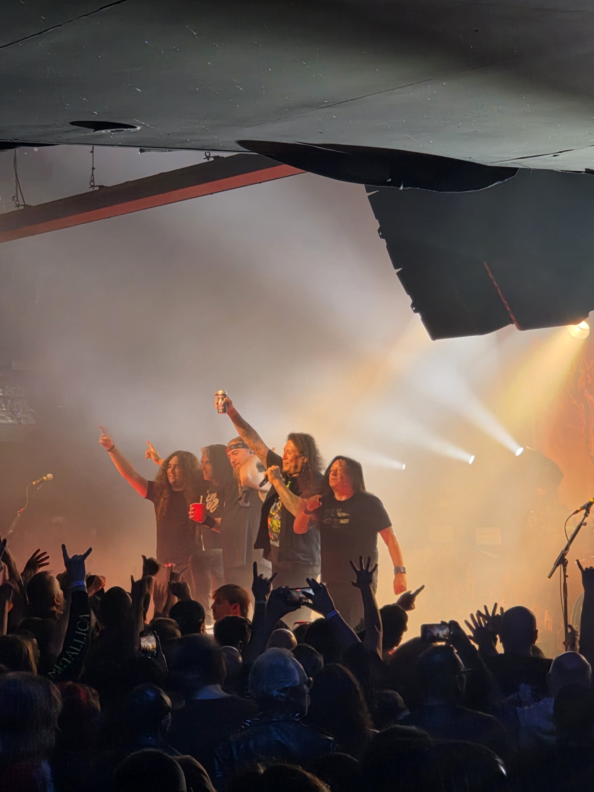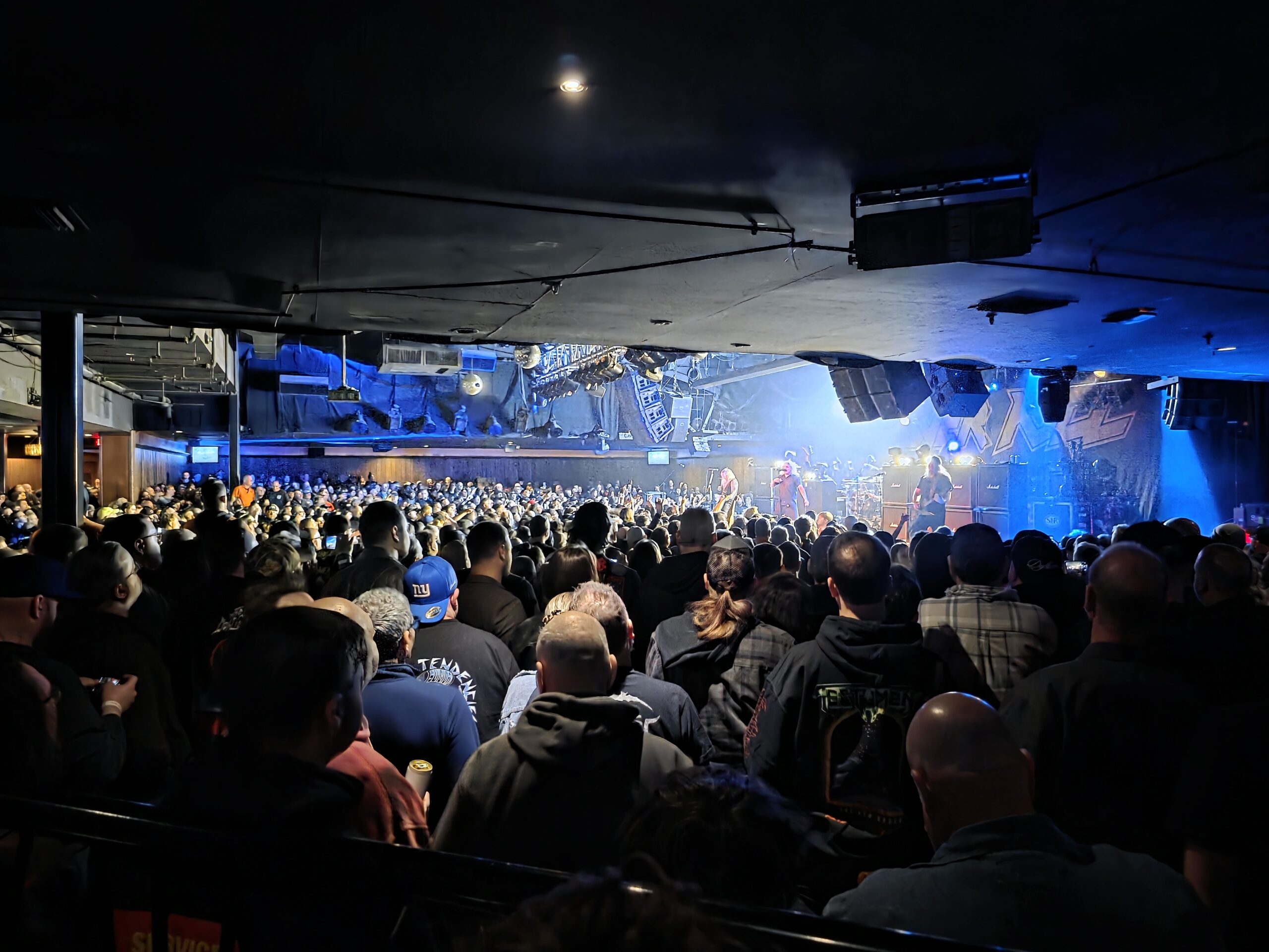 We got up the ramp, ready to enter, and proceeded to the area reserved for those with physical needs. It provided a generous vantage point, to the right of the stage, and elevated. While the place isn’t too big, it was utterly packed. By 7:15, when Destruction was playing, the floor was full, and there was simply no way I was going to get closer for the next bands. I grabbed Mat a shirt, purchased a few drinks and returned, making another round trip (or two) as Overkill hit the stage.